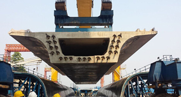5月13日下午16時,伴隨著機器的轟鳴聲、鞭炮聲、熱烈的掌聲和歡呼聲,900T輪式提梁機將737.6噸箱梁緩緩提起,成