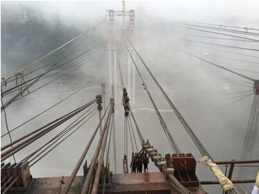 大橋采用無(wú)支架纜索吊裝施工技術(shù),該技術(shù)工藝極其復(fù)雜,C100砼是首次在國(guó)內(nèi)橋梁工程應(yīng)用,其科技含量極高且對(duì)橋梁工程發(fā)展意義重大。由于古藺地處山區(qū)交通極為不便,氣候條件惡劣,開(kāi)工時(shí)間較原計(jì)劃晚了一年之久,工期緊、施工難度極大,面對(duì)重重困難,項(xiàng)目部全體員工在領(lǐng)導(dǎo)班子的帶領(lǐng)下充分發(fā)揚(yáng)了偉大的“川橋人”精神,勇于擔(dān)當(dāng),敢于破難,團(tuán)結(jié)一心,艱苦奮戰(zhàn),大力開(kāi)展科技攻關(guān),科學(xué)組織施工生產(chǎn),取得了一個(gè)又一個(gè)的階段性勝利,2014年3月20日拱座開(kāi)挖,2014年5月拱座施工完成,2014年10月交界墩施工完成,2014年11月7日索塔拼裝,2014年12月31日索塔拼裝完成,2015年1月31日纜索系統(tǒng)形成,2015年2月6日開(kāi)始吊裝主橋鋼管勁性骨架,2015年3月28日勁性骨架合龍,50天實(shí)現(xiàn)了主橋合龍,其中凝聚了“川橋人”的艱辛、智慧和汗水。