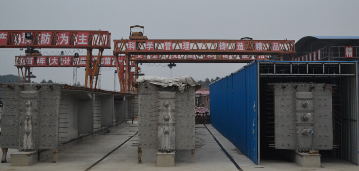 自2013年8月進(jìn)入麻武高速后,T梁預(yù)制場與項(xiàng)目部駐地同步規(guī)劃建設(shè)。于12月份正式投產(chǎn)生產(chǎn)梁板。為提升梁板質(zhì)量,加快生產(chǎn)形象進(jìn)度,積極響應(yīng)業(yè)主標(biāo)準(zhǔn)化施工要求,首次引進(jìn)鋼筋數(shù)控彎曲機(jī),數(shù)控張拉壓漿設(shè)備,T梁養(yǎng)生夏季噴淋養(yǎng)護(hù)、冬季蒸汽養(yǎng)護(hù)設(shè)施,保持一年四季進(jìn)行T梁生產(chǎn)作業(yè)。為追趕晚一、三標(biāo)半年建設(shè)工期提供保障。