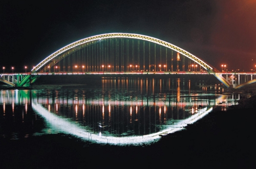 全長(zhǎng)1375米,主橋長(zhǎng)294米,主跨202米,鋼管砼桁架拱橋,1997年10月建成通車。