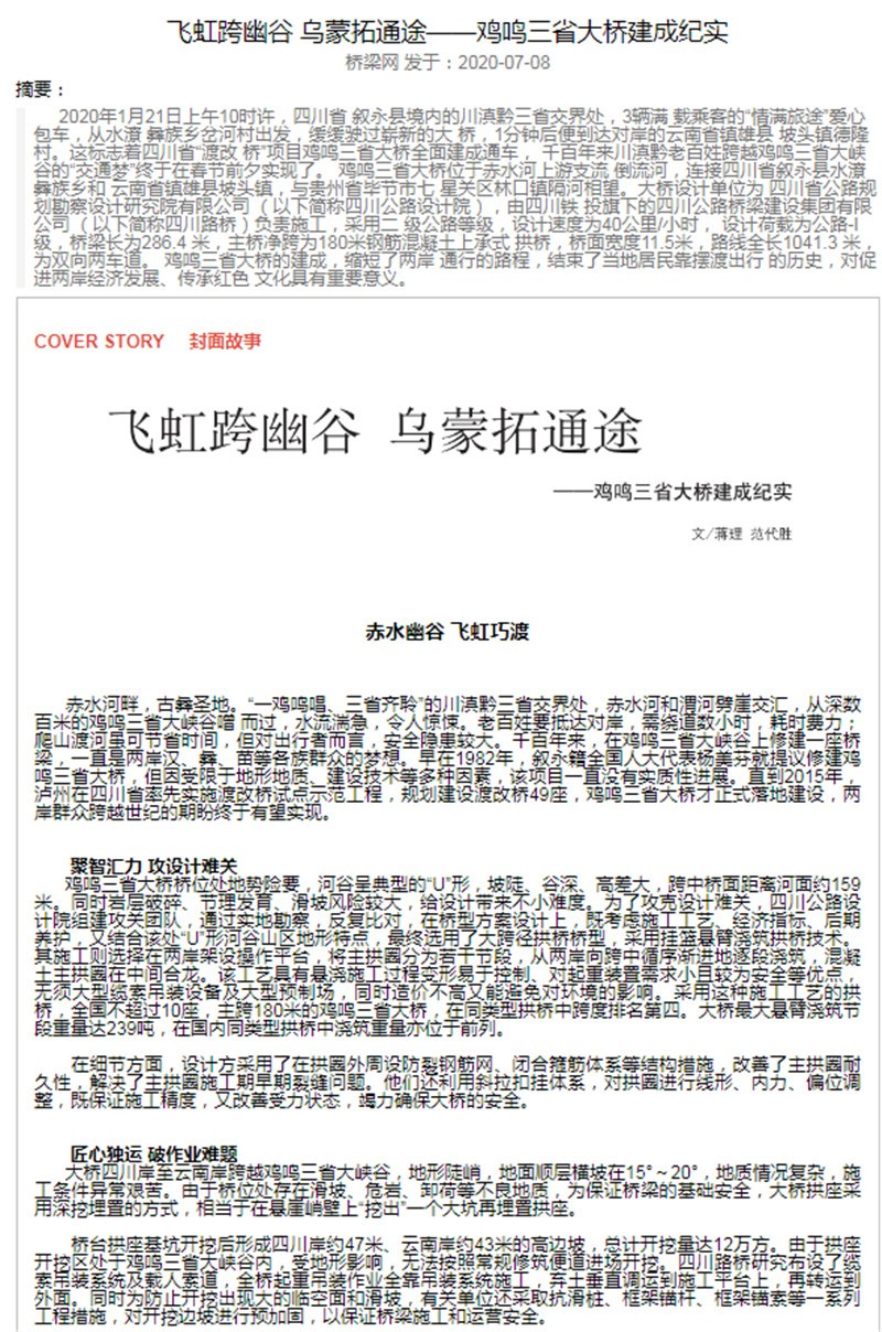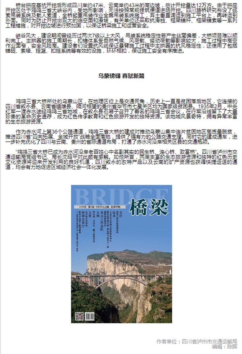 雞鳴三省大橋喜提《橋梁》雜志封面:飛虹跨幽谷 烏蒙拓通途