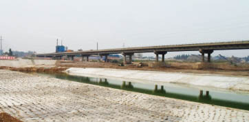 工程包括省道S105線綿竹段石亭江一號橋、石亭江廣洛大橋、富新綿遠(yuǎn)河大橋三座基礎(chǔ)防護工程。由于歷年來采砂嚴(yán)重,造成河床遠(yuǎn)低于原設(shè)計標(biāo)高,為恢復(fù)橋下沉積物,保證橋梁樁基安全使用。設(shè)計采用在橋下游100米左右處修建砼復(fù)式斷面攔河防沖壩,以淤積橋下沉積物,保證橋梁樁基的埋置深度,從而保證橋梁安全使用。三座橋工程量共計土石方工程量約300000立方米,C30鋼筋砼壩體及護岸砼澆筑約50000立方米,帶肋鋼筋約1500噸。